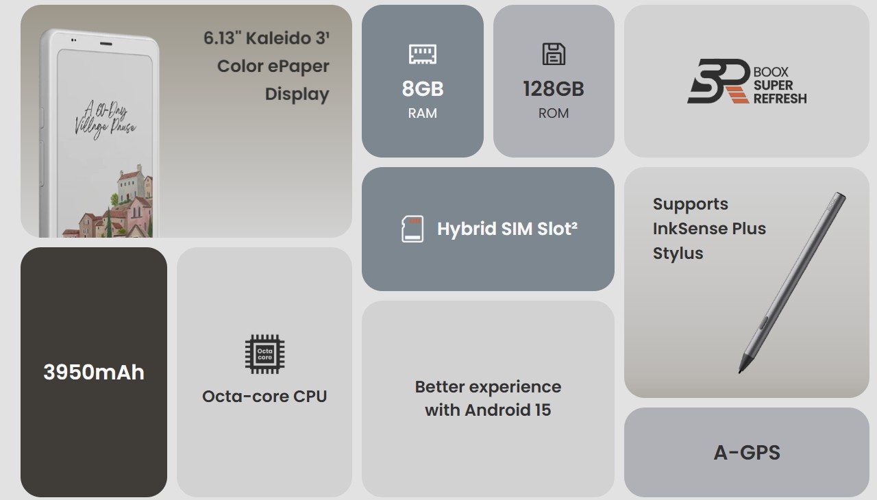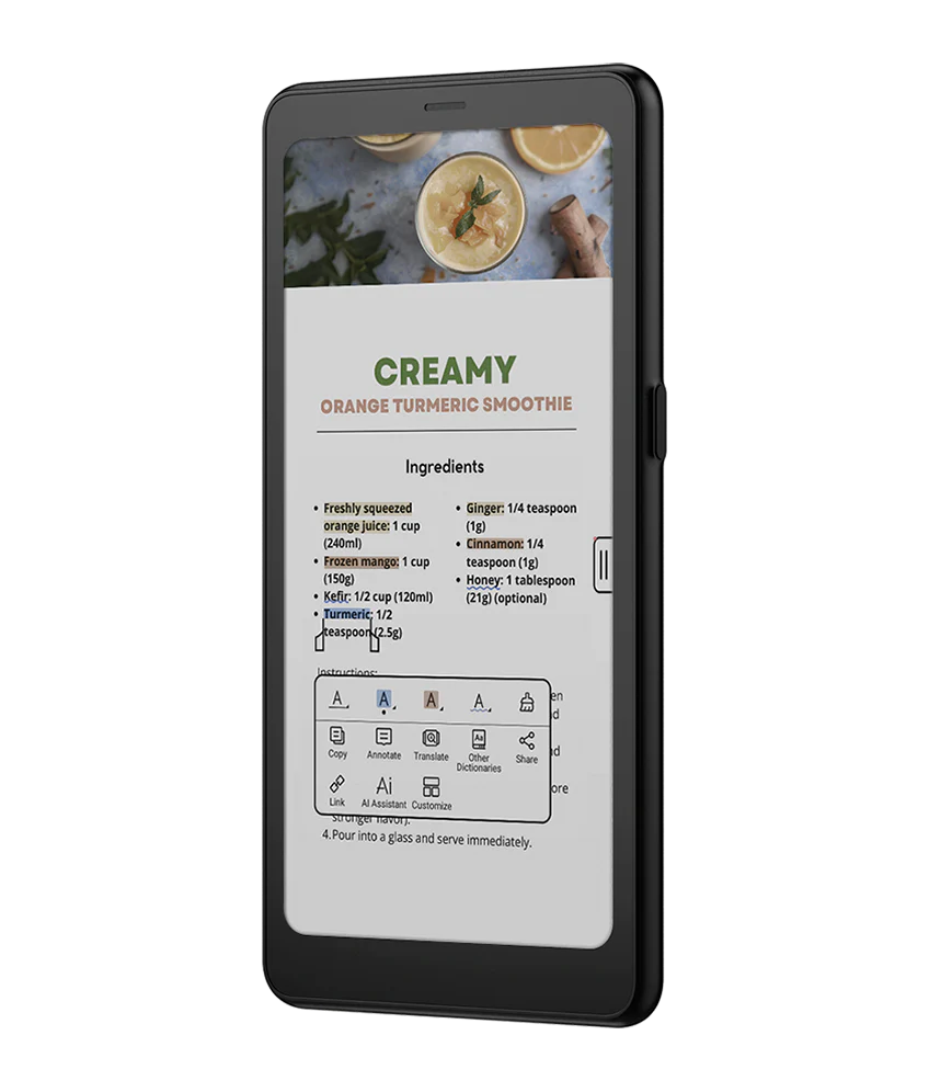 تصميم هادئ وواضح، مُركّز على المستخدم. مُجهّز بمعالج ثماني النواة قوي، وذاكرة وصول عشوائي (RAM) سعة 8 جيجابايت، وتقنية BOOX Super Refresh⁵، ليُقدّم أداءً سلسًا وسريع الاستجابة عند الحاجة.
